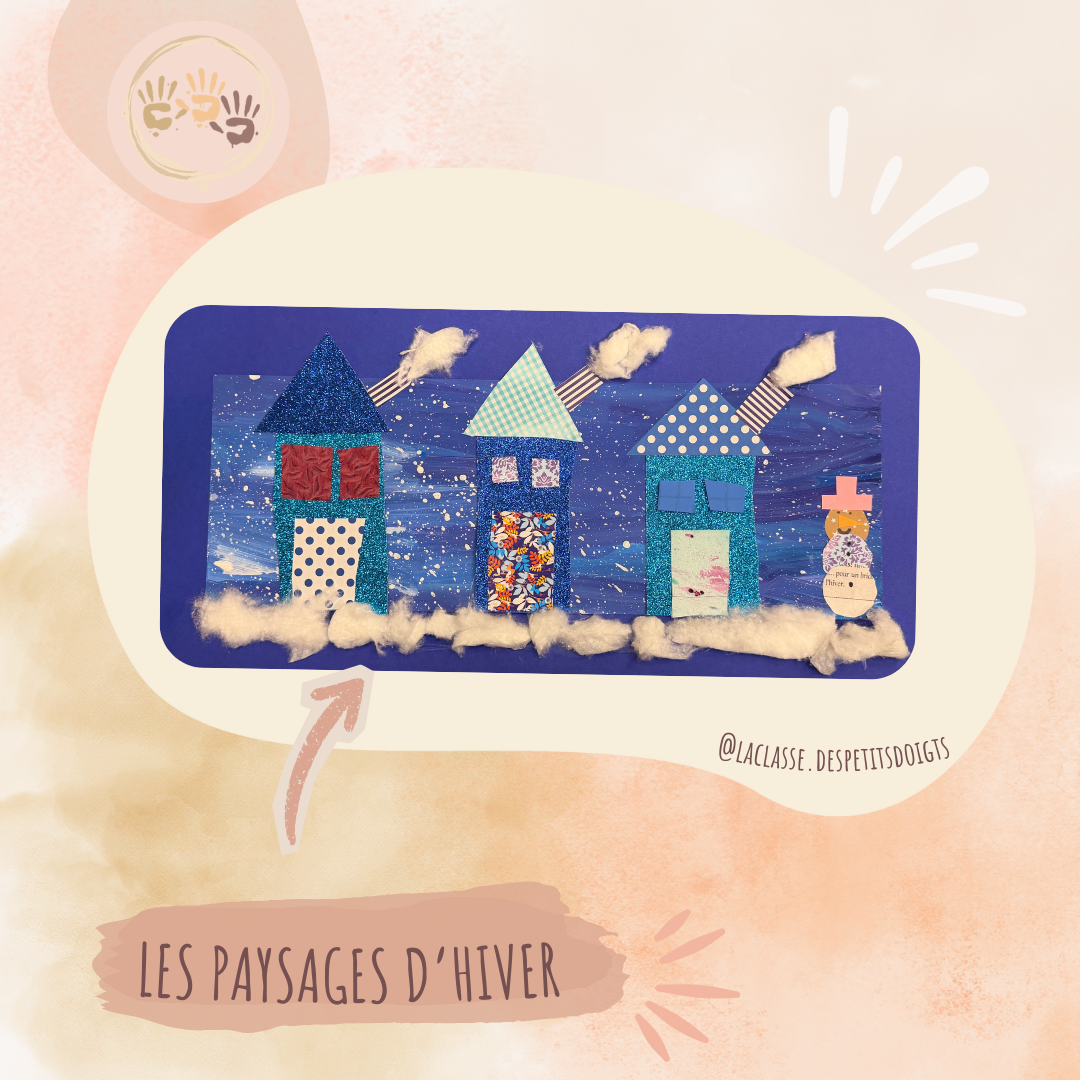 Un fond peint avec des nuances de bleus et de la neige... Du découpage, du collage, de la créativité.. un joli travail en autonomie dans les tons hivernaux.